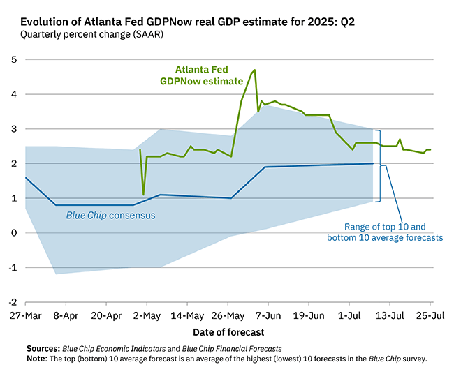 As more monthly source data becomes available, the GDPNow forecast for a particular quarter evolves and generally becomes more accurate. That said, the forecasting error can still be substantial just prior to the “advance” GDP estimate release. It is important to emphasize that the Atlanta Fed GDPNow forecast is a model projection not subject to judgmental adjustments. It is not an official forecast of the Federal Reserve Bank of Atlanta, its president, the Federal Reserve System, or the FOMC.